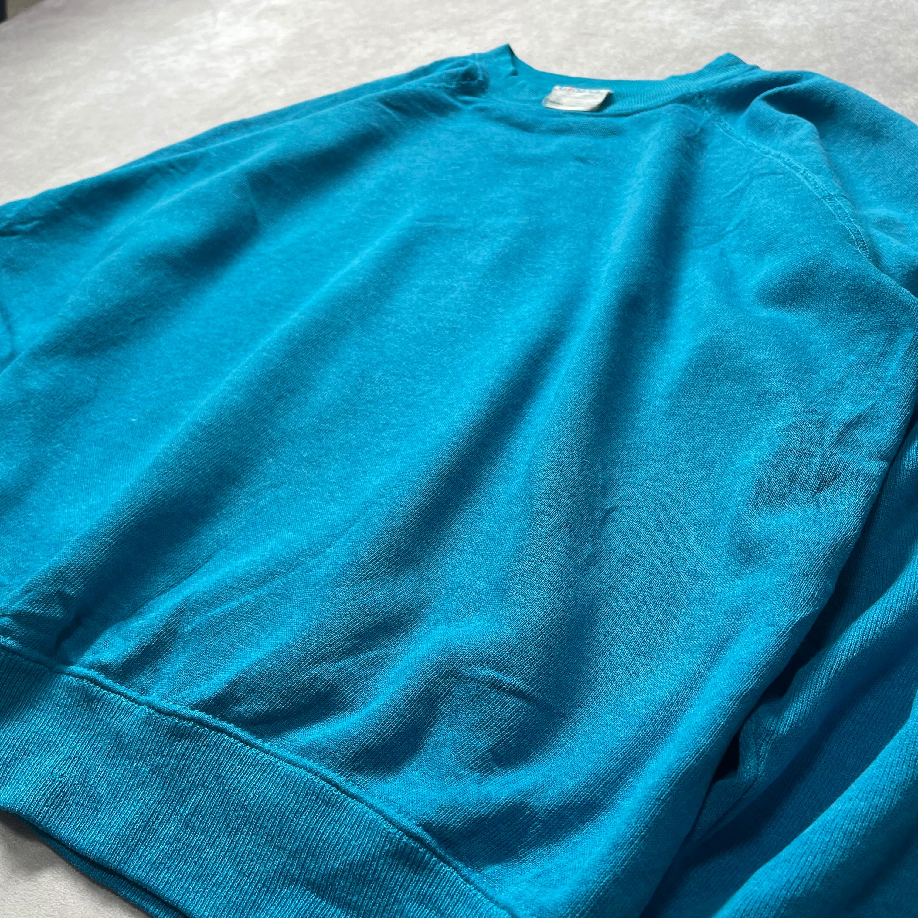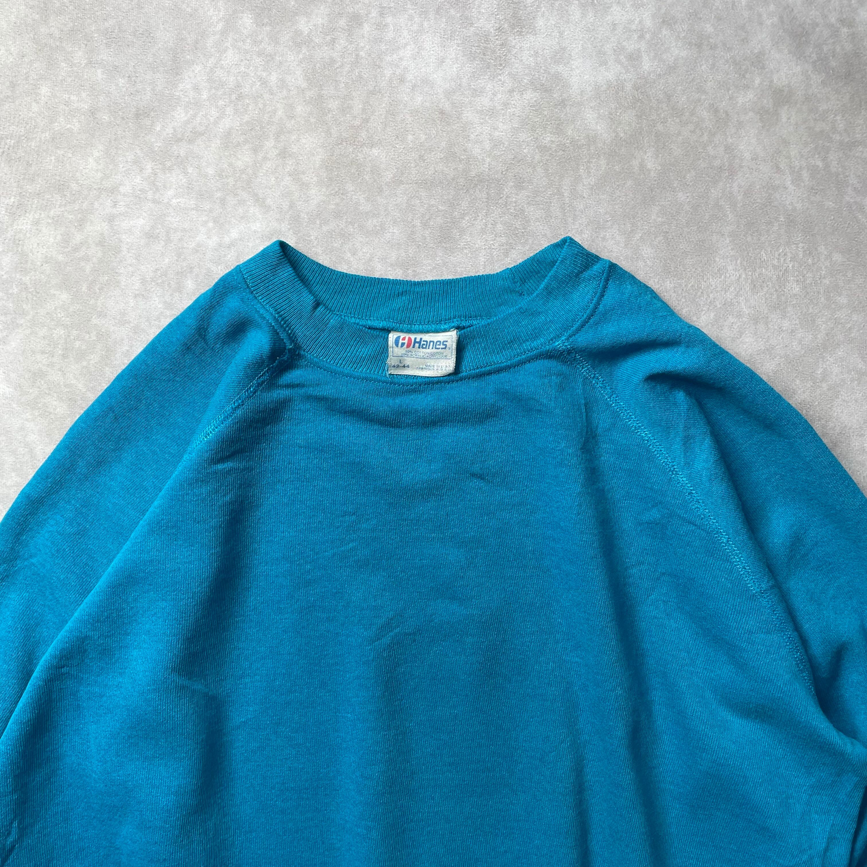 今となっては希少な80年代から90年代のアメリカ製 Hanes ヘインズ 無地 ラグランスウェット Lサイズ エメラルドブルーカラーです。